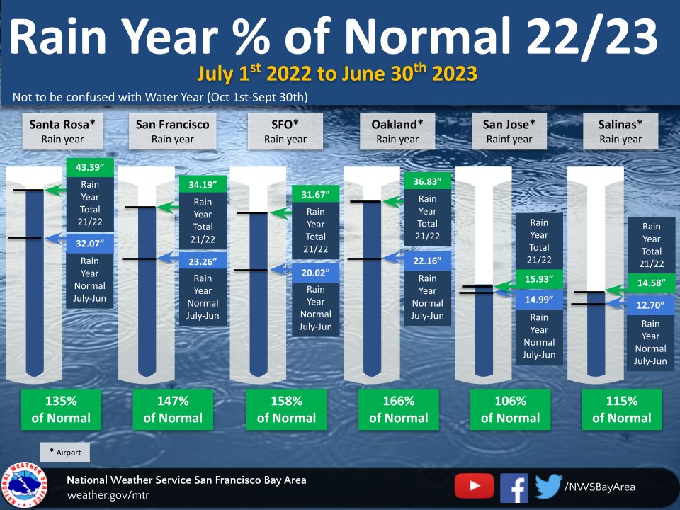 You probably aren’t very surprised to see those numbers, but I wanted to specifically call out the difference between the Rain Year (July 1-June 30) and the Water Year (Oct 1-Sept 30). California focuses a lot on the Water Year, but many places in the U.S. focus on the Rain Year. On a hyper local level, the difference in timeframe actually resulted in a ~4-6 inch difference between the two time spans.