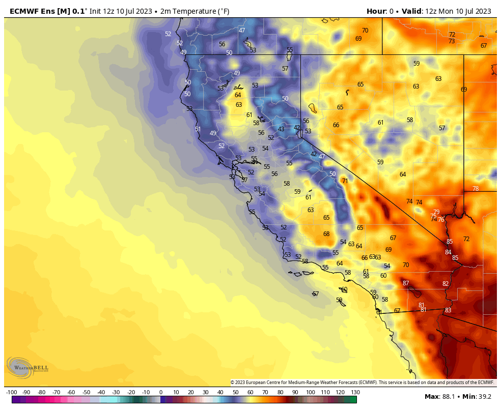 Looking forward now, much of California is expected to see its first significant heatwave over the next week or so. Take this with a grain of salt, but here’s a GIF of projected 2 meter temperatures from the ECMWF ensemble model (between about now and next Monday).